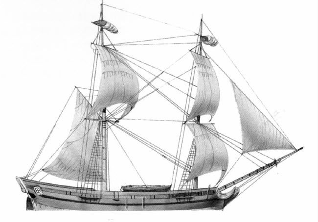 流浪者号是一艘双桅纵帆船,前桅有四张横帆,前桅大帆在下方,下帆的上面是第二帆,前桅顶部是第三帆,最上面是顶帆。