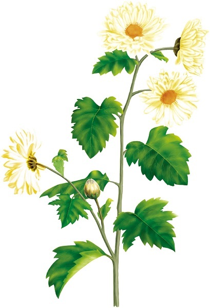 菊花生长在雍州川泽以及田野中,正月采根,三月采叶,五月采茎,九月采花,十一月采实,都阴干。菊的品种有很多,只是紫茎的气香,叶子厚而且非常柔软,嫩的时候可以食用,花稍微有些大,味道特别甘甜,这属于真品。如果茎是青色的,叶子细,气味浓烈像艾蒿,花小,味道苦,名字叫作苦薏,这不是真品。花大而且香的是甘菊;花小而呈黄色的是黄菊;花小而气恶的是野菊。由此可见,菊类主要分甘、苦两种。若为食品,需用甘菊;若要入药,则甘、苦皆可,但不能用叫作“苦薏”的野菊。