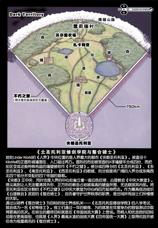 地处Under World《人界》中央位置的是人界最大的都市《央都圣托利亚》。被直径十KiloMel的正圆形城墙围住,人口超过两万。圆形的市街被坚固的X字形墙壁平分成四份,而把街区变成这般特殊构造的墙壁被称作《不朽之壁》。被分成四等分《北圣托利亚》、《东圣托利亚》、《南圣托利亚》、《西圣托利亚》的都城,则分別是将广阔的人界分成东南西北四个部分并支配的四个帝都的首都。