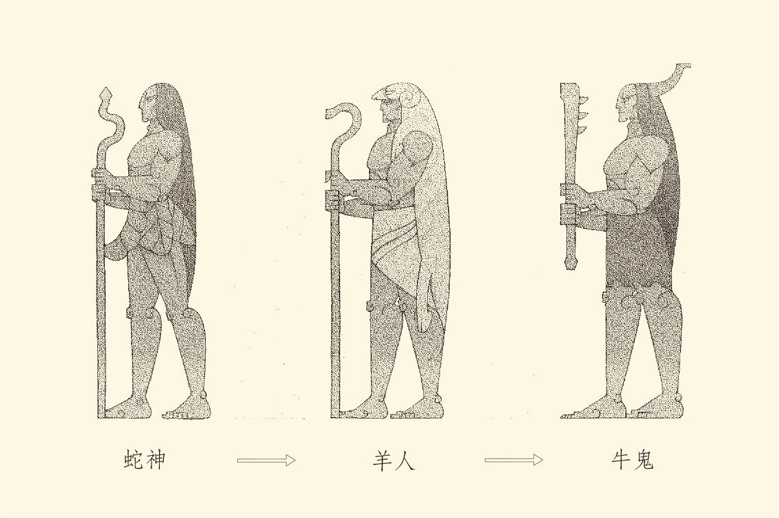 麻烦在于,蛇神、羊人、牛鬼,在我们这里不但表现为三个阶段,也表现为三个地区和三个族群:蛇神是东方夷族或南方蛮族,羊人是西方的羌族,牛鬼则是来到中原的炎帝族。炎帝虽然本是羌族,却不能跟原始羌族画等号。正如希腊人是雅利安人的一支,雅利安人却不等于希腊人。