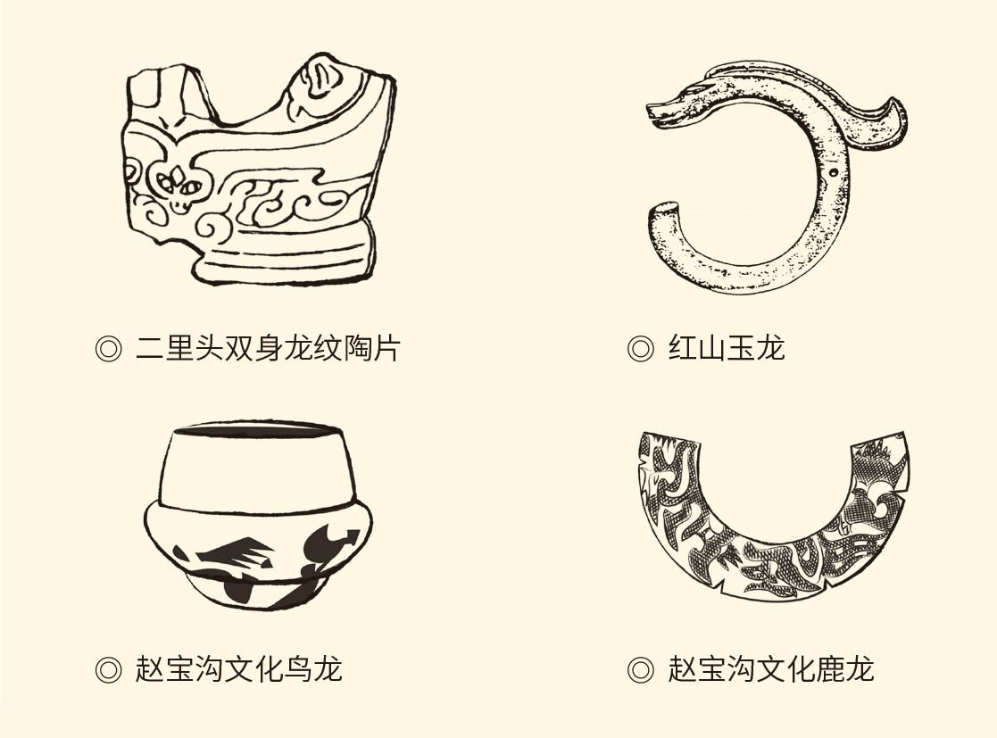 [23]龙的形象早已出现,见干振玮《龙纹图像的考古学依据》、陆思贤《神话考古》、王先胜《黄帝部落的图腾是什么》。例证有:距今一万年的山西吉县柿子滩龙纹岩画,距今六七千年前的赵宝沟文化鸟首龙、鹿首鱼尾龙、猪首牛角龙,濮阳西水坡仰韶文化鳄鱼龙,红山文化综合了熊、马、蛇等形象的玉龙,内蒙古清水河出土庙底沟类型巨型鱼龙夯土雕像,四千多年前陶寺文化的蟠龙,二里头文化一首双身龙纹陶片。