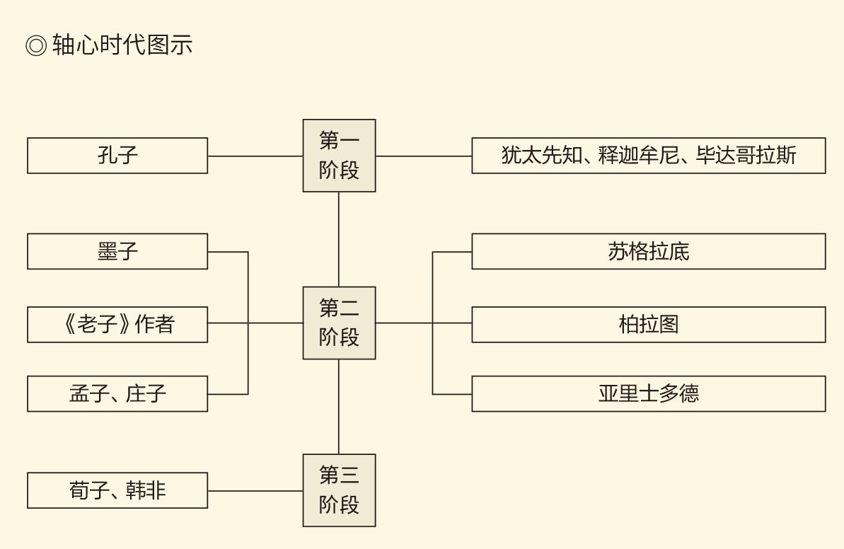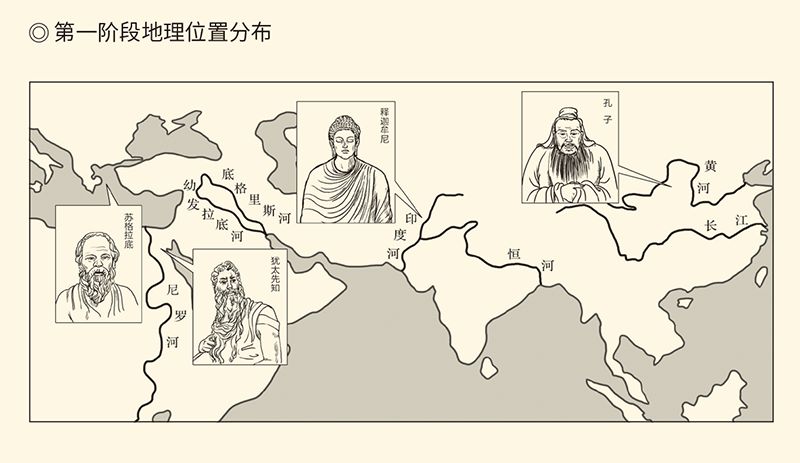 大体上说,四百年的轴心时代可分为三个阶段。第一阶段,孔子与犹太先知、释迦牟尼、毕达哥拉斯同时,四大文明礼炮齐鸣。第二阶段,墨子与苏格拉底同时,《老子》一书的作者与柏拉图同时,[3]孟子和庄子与亚里士多德同时,中国与希腊并肩前进。第三阶段,希腊人也退出历史舞台,只剩下我们的荀子和韩非。