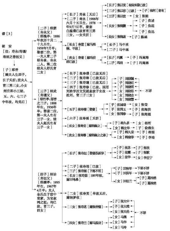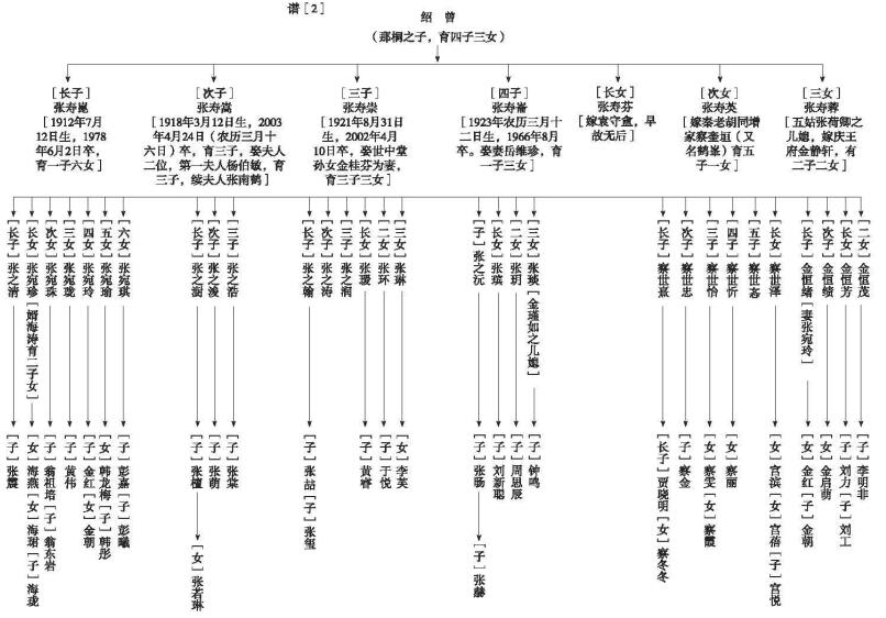 一、本材料是由张寿椿执笔。张寿椿是以寿崇三哥在20世纪90年代中后期经多方考证所写出的从始祖开始至十三世家谱系标为基本素材,又参照绍武大爷的寿珊五弟(亦以寿崇三哥所写材料为蓝本)自拟的铭安、浦安、文安祖爷三支脉系下的子、孙素列表;而寿椿所拟是从十世起增添了从姑祖母辈及以下各世中女性姐妹内容而写就的。