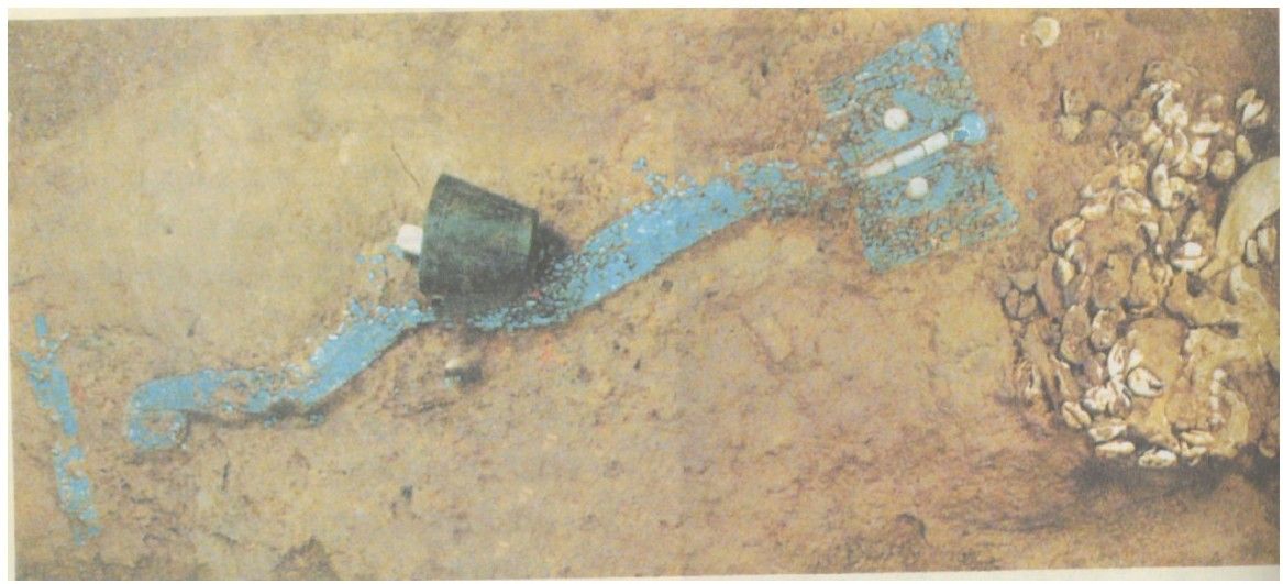 王巍:我觉得,从这个角度上也可以反映出夏王朝,至少是二里头遗址所代表的形态应该是一个国家的形态。而这个国家又位于传说或文献记载中夏的中心区域,其年代又紧接着商之前,所以这个国家除了是夏朝还能是哪个别的国家或朝代呢?我们当时还发现了数座贵族墓葬,其中的一座墓葬出土了一件珍贵的绿松石龙。它的长度有64公分,大概由2000多片绿松石片镶嵌。制作这个龙,先要用大大小小的绿松石块磨成小薄片,再进行镶嵌,这个工艺是很复杂的,我们估计它是在宫城南边的绿松石作坊里做的。
