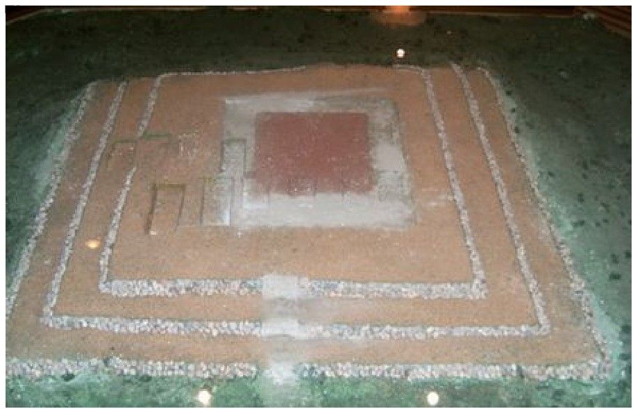 牟永抗:瑶山最重要的就是它的祭坛。它的面积有400多平方米,在近中部的位置挖出了一条南北长约7.7米,东西宽约6米左右的回字形沟槽,沟槽宽约1.7-2.1米,深约0.65-0.85米,沟槽中用山下纯净的灰色黏土填满,与山上原来的红黄色土壤形成鲜明对比,从而在平面上形成了内外不同的三重色土。