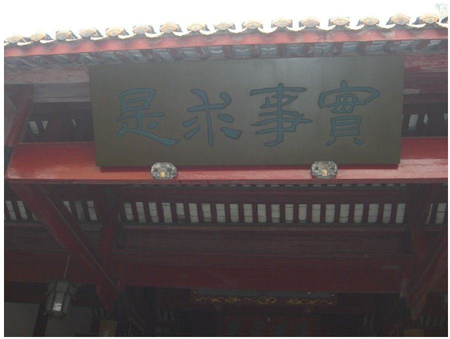 王鲁湘:“实事求是”两边的对联好像是“工善其事必利其器”、“业精于勤而荒于嬉”,两个嵌头正好是“工业”二字。