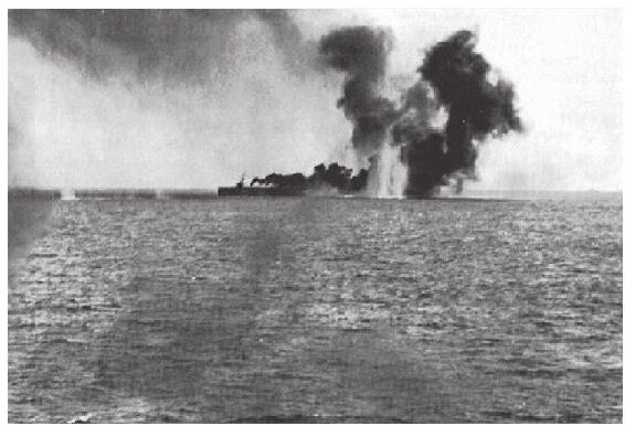殿后的“甘比尔湾”号最惨,在一个小时内,几乎每分钟都要被炮弹击中一次。直到它沉没时,一艘日军巡洋舰还在不停地向它发炮轰击。