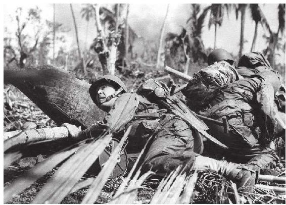 正在躲避日军机枪扫射的美军士兵。在并不比别人多一条命的前提下,善于隐蔽和保护自己也是战场上必须遵守的法则之一