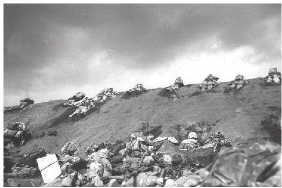 “圣诞树”下的大兵们可遭了罪。他们起先没有遇到太多困难,已经一口气向前挺进了200余米,现在却发现自己已经被完全钉死了。除了炮弹外,陆战队员还面临着更多的危险。那些外表似乎毫无危险的沙丘,里面却隐藏着日军的机步枪,狭窄的枪眼距离地面只有几厘米高度,而且正对着他们的前进路线。