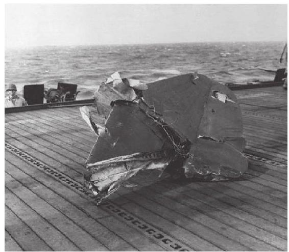 撞在美军航母甲板上的特攻机尾部残骸。这是一架“彗星”式俯冲轰炸机,本来是用以替代99式“舰爆”的,但在日本海军完全失去制空权的情况下,只能沦为自杀飞机了