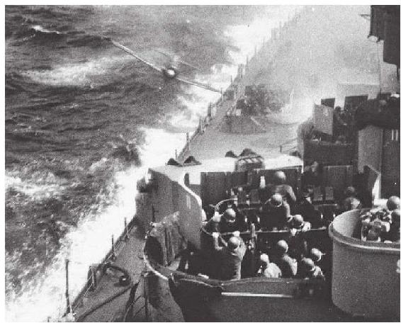 向美舰进行自杀攻击的一架“零”式。不管“零”式最后能不能撞上来,这情景都让船上的人不由得感到肝颤