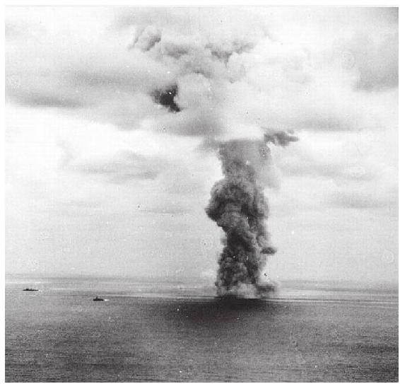 下午2点20分,舰炮炮膛里的炮弹滑落下来,撞穿了弹药舱甲板,弹药舱里的炮弹终于被引爆了。远远望去,“大和”号上出现了一道炫目的强光,仿佛是金灿灿的朝阳喷薄欲出,之后,伴随着一声惊雷般的巨响,剧烈的爆炸几乎将“大和”号的舰体完全炸断。