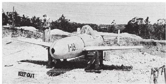 美军在读谷机场缴获的一架“樱花弹”。它的舱门从里面不能打开,也没有起落架,无法驶回基地降落在跑道上,这就决定了驾驶“樱花弹”的飞行员从开始飞行的那一刻起,就只有死路一条