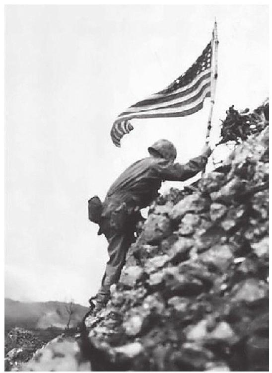 陆战一师一营营长罗斯中校冒着可能受到日军狙击的危险,勇敢地在首里城的城墙上升起了旗帜