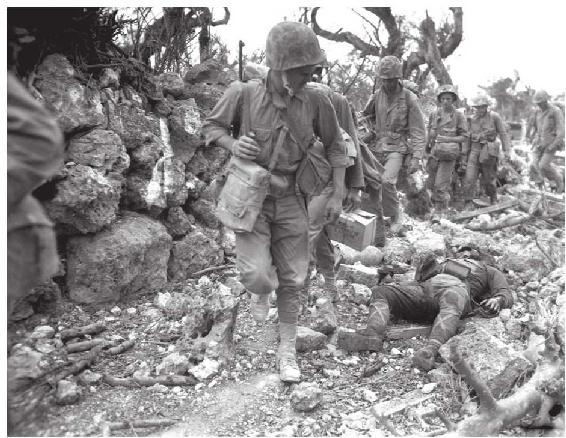 陆战队士兵穿过一座已被战火破坏的村庄,路旁有阵亡日本兵的尸体。置身于这种狼藉一片的环境,显然谁的心情都不可能好得起来