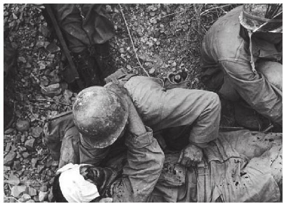 陆战队员正在救治自己的同伴。“不抛弃任何一个战友”,实际上也是卡尔逊“工合”精神的体现,即“人人为我,我为人人”
