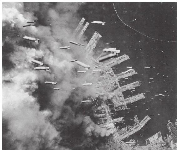 B-29轰炸机在投掷燃烧弹,飞机下方是一座码头