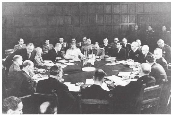 斯大林和莫洛托夫参加的是波茨坦会议。会议期间,美英中三国联合发表了《波茨坦公告》,除要求日本军队立刻无条件投降外,还明确规定,日本领土必须恢复中日甲午战争以前的状态,台湾岛、澎湖列岛均归还中国,投降后的日本其主权仅限于本州、北海道、九州、四国及由盟国指定的岛屿。