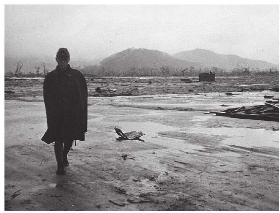 被完全夷为平地的广岛,一名日本军人落寞地独自行走着。“小男孩”释放了巨大能量,加上核辐射,此前人类从未拥有过具有如此大的杀伤力的武器