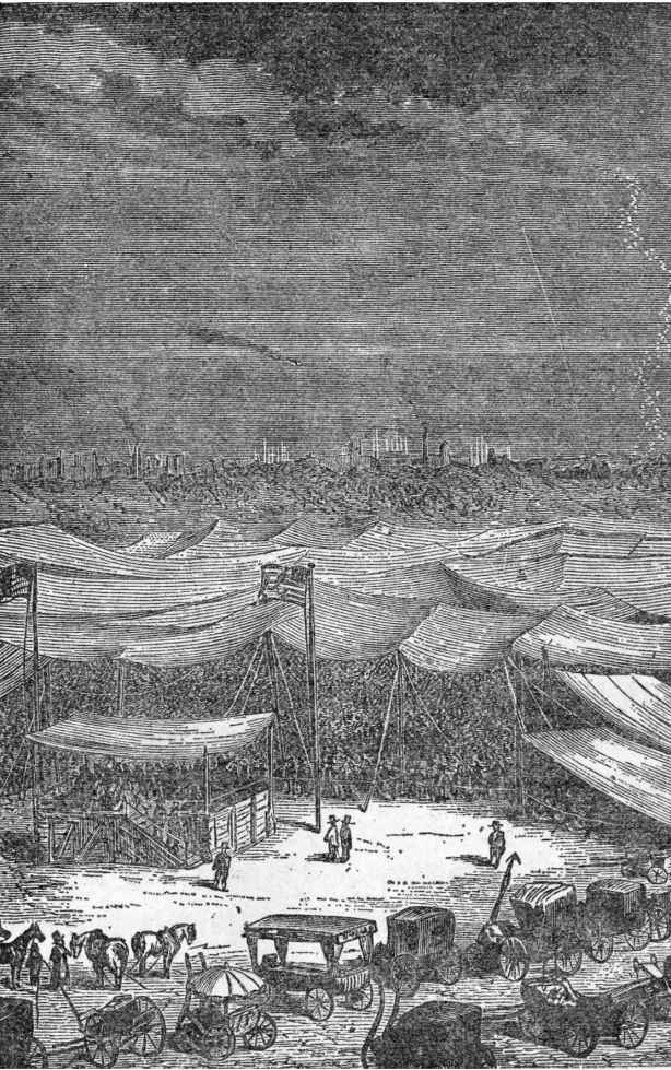 这次公众大会的场址选在城外的一大片开阔地上。由于港口有大量的帆布,只用了几个钟头,一个巨大的顶棚就在炎热的草地上方伸展开来,遮住了灼热的阳光。30万人勇敢地耐着闷热坐了几个小时,等待着法国人的到来。因为来的人太多,只有前边的三分之一能看得见,听得着;而中间的三分之一勉强能看到一点,但听不见声音;至于坐在后边的三分之一就什么也看不见听不见了。三点钟,米歇尔·阿当在大炮俱乐部重要成员的陪同下登场了。他的右臂由巴比康挽着,左臂被梅斯顿抱着,神采奕奕,比午时的太阳还耀人,就连脸色的红润劲儿也和太阳差不多。阿当爬上台子,往下一看,是一片黑压压的礼帽构成的海洋。