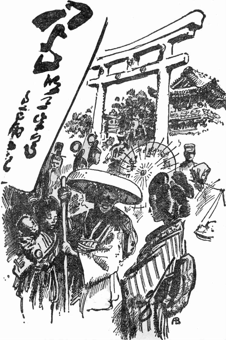 最后,万事通发现自己来到了郊外,置身于一望无际的稻田之间。在这里各种鲜花仍未凋败,散发着最后的余香,其中那些娇艳的茶花不是生长在矮小的山茶树丛中,而是开在高大的山茶树上。在那些围有竹篱的果园里,生长着樱桃树、李子树和苹果树,可是当地人栽种这些果树,不是为了水果,而是为了卖花。果园里安放了一些模样古怪的草人,以及不断尖叫的驱鸟器,用来驱赶麻雀、鸽子、乌鸦和其他贪食的鸟类。这里没有一棵大树上没有鹰巢,没有一棵柳荫下不见单腿独立的鹭鸶,它们看上去满怀忧思。在这里,小鸟、野鸭、山鹰、大雁随处可见,另外还有很多仙鹤。日本人把仙鹤看作神鸟,象征着富贵长寿。