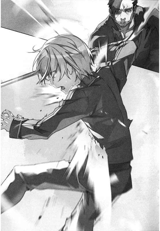 被秘奥义的光牵引著突进的优吉欧的前方,把剑一挥而尽的男人跟前,有著什么。在空中横过的一直线,透明地摇曳著。就像将近斩击开始之前,包裹著男人的剑的雾一般。