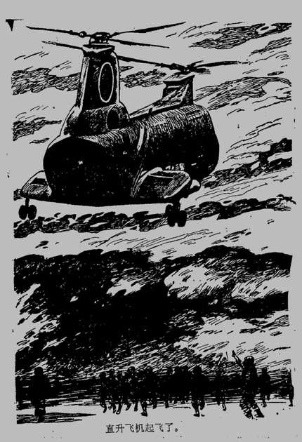 正在这时,直升飞机舞起阵阵雪烟起飞了,机身在摇摇欲坠似的慢慢上升,终于离开了地面,但又象迷失方向般地在几米上空停住。