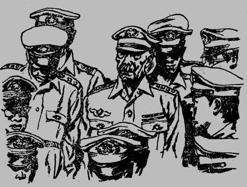 他们把这些旧军官称作“单细胞”、“老不死”、“退休老头儿”,显示出他们心眼儿里的蔑视。“军神”这个绰号也是战后派军官给起的。对战后派来说,只要旧军官还压在他们头上,就不能取得发言权。旧军官是在军人勅谕(原注:是指日本明治十五年一月四日,明治天皇对陆海军的勅谕。以后就作为对军人进行法西斯教育的思想基础。)和忠君爱国精神熏陶下培育起来的军人,其中有不少人还时时梦想尽快地重建一支“帝国军队”。