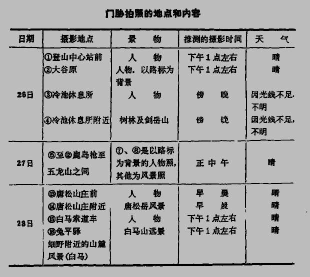 “表上的摄影时间是根据照片上光线的强弱和大山的影子推测的。5月26日的日落时间接近7点,所以③和④的拍摄时间是6点左右,照此推算④和⑤的时间间隔大约为18个小时,我想研究研究门胁有没有可能在这段时间内往返川崎。”
