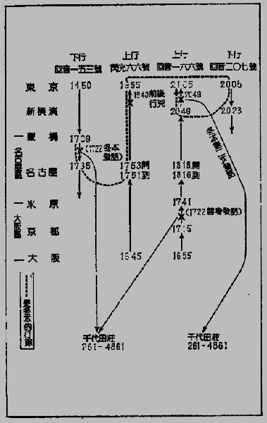 “其他下行的回音号,十七时二十二分不在名古屋,而且都不能满足赶上闪光六六号的条件,所以冬本一是搭乘回音一五三号。冬本在这一天下午两点钟左右离开大阪,所以可能坐上行的回音号回到东京。从这个角度来看当天下午两点以后,从新大阪开出的回音号时,从十四时十五分开的回音一五○号开始,有三六六号、三九四号、一五四号、一五六号等五班车。这些班车都在下行回音一五三号到达丰桥以前到达该站。冬本一定是坐这五班上行车其中的一班回到丰桥,在这里转换下行的回音一五三号,然后再发出第一次通话。”佐野的声音充满信心。