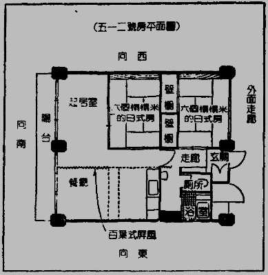 五一二号房,是该公寓命名为KC二二—G型的三房两厅,隔间的情形如平面图。在客厅与餐厅之间,由住户装上百叶式屏风。