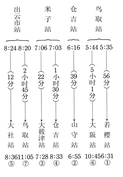 吉敷列出这张新表后,又发现了另一件让他惊讶的事。列车始发的时间竟然按照时间的前后排列着。五点三十五分从鸟取车站开始,八点二十四分在出云市车站结束,其间大约是三个小时,准确地说是两小时四十九分钟。如果以漂流物到站的时间来考量的话,从第一件到最后一件的时间是四小时三十四分钟。用起点的时间来考量的话,时间缩短了很多。