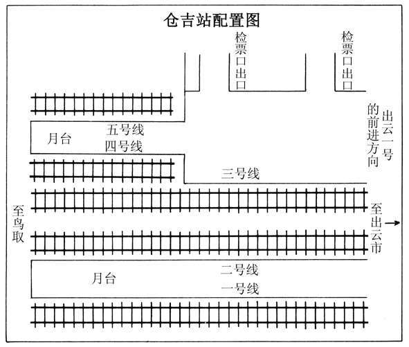 “不是,三号线月台的另一边是检票口。我画图给你看你就明白了。很简单。”于是石田便拿出纸笔画了一张图,接着说,“就像这样,‘出云一号’抵达三号线月台,而五号线月台就在三号线月台的后方。所以凶手只要在‘出云一号’内往后面车厢移动,等待仓吉线列车一到,就可以立刻下车,把东西放到相反方向的仓吉线列车上。虽然只有一分钟,但已经足够完成那样的工作了。我以前就曾经利用一分钟的时间下车买面包,再回到车上。”
