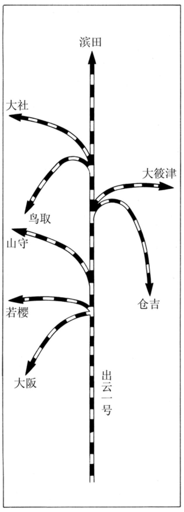 因为是手绘的图,所以歪歪扭扭的看不出人的模样。上面的分岔可以视为是左右的手,各有两只;下面的三个分岔虽然样子古怪,但可视为脚;“出云一号”前进的方向是滨田,所以可以把滨田视为头。头是滨田的话,那么……