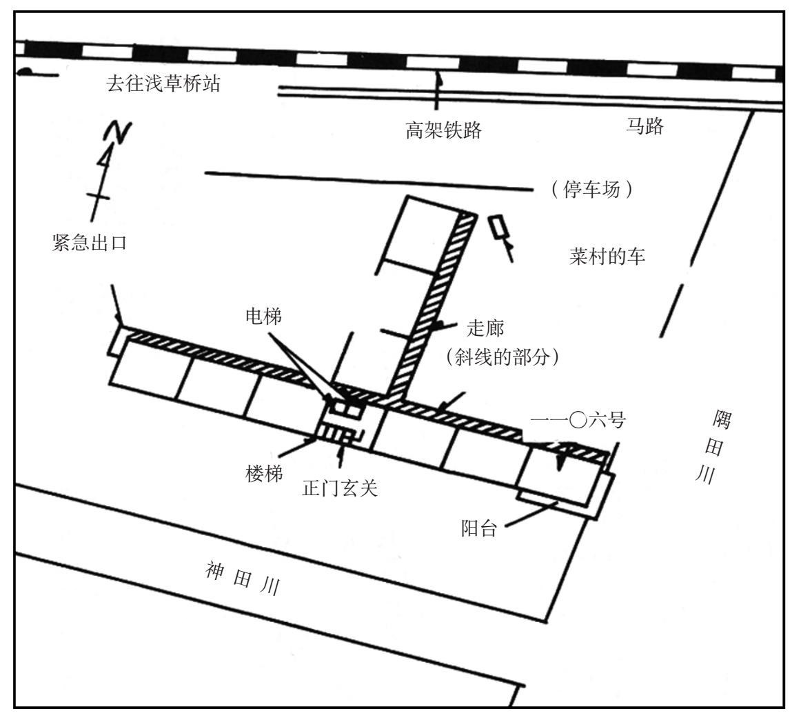上到顶层我才明白T HOME的含义,这栋公寓楼从上面看下去就是一个巨大的T字形。这一点对事件很重要,所以附图参照(图二)。Bird Cage的主办人糸井居住的一一〇六号室是在十一层的最顶头,以T字来说就是左边的肩头那里。