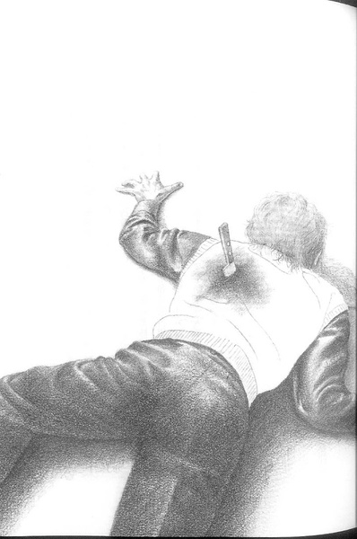 他穿着和两星期前相同的黑色厚毛衣和暗红色的背心。他虽然面朝下,但是脸却像是将下巴向前突出似地朝着前方,有如圣诞老人的长长白胡须在地板上伸展开来。他以恐怖的表情盯着空中看,动也不动……