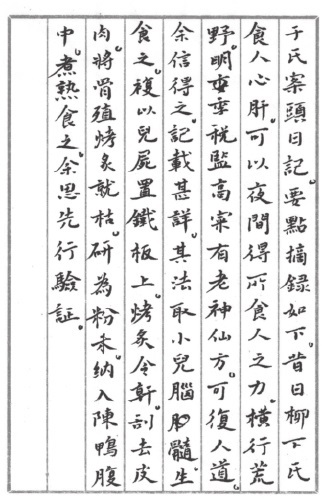 金木摘录的李润龙日记:“……昔日柳下氏食人心肝,可以夜间得所食人之力,横行荒野。明季税监高宷,有老神仙方,可复人道,余信得之,记载甚详。其法取小儿脑髓生食之,复以儿尸置铁板上,烤炙令干,刮去皮肉,将骨殖烤炙就枯,研为粉末,纳入陈鸭腹中,煮熟食之……”