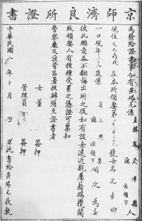 京师济良所证书。女子投奔济良所,需先提交书面申请,不识字的可以找人代写,经过京师警察厅行政处批准后,才能正式发放证书。一旦进了济良所,就要断绝一切外界联系,家属见面也得严格审核,谨防所女再次被领走卖掉