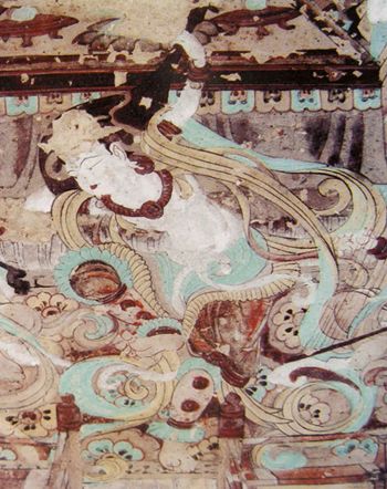 和“胡乐”相伴的是“胡舞”,其中最有名的是胡旋舞(来自康国,在今乌兹别克斯坦境内)、胡腾舞和柘枝舞(来自石国,在今塔什干一带)。《新唐书•礼乐志》说:“胡旋舞舞者立球上,旋转如风。”许多诗人都描绘过胡旋舞。如白居易的诗:“胡旋女,胡旋女,心应弦,手应鼓。弦鼓一声双袖举,回雪飘飖转蓬舞。左旋右旋不知疲,千匝万周无已时。”当时在宫廷中经常表演“胡乐”和“胡舞”。唐玄宗吹奏玉笛和敲击羯鼓都达到极高水平。当时的重臣宋璟也善羯鼓。据记载,宋璟还提出,敲击羯鼓时,应是“头如青山峰”、“手如白雨点”,以充分发挥羯鼓作为“八音之领袖”(唐玄宗语)的功能。