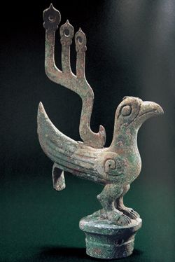 1980年,在四川广汉三星堆遗址出土的文物,引起了世界的轰动。出土文物中包括大量的青铜器。时间至少在三千年以上。这些属于古代蜀国的青铜器,形式多样,其中有人头像、立人像、跪坐人像、兽面具,又有罍、尊、盘、戈等器具,还有大量的装饰品,包括铜鸟、神树、铜鹿和其他动物类头像等。