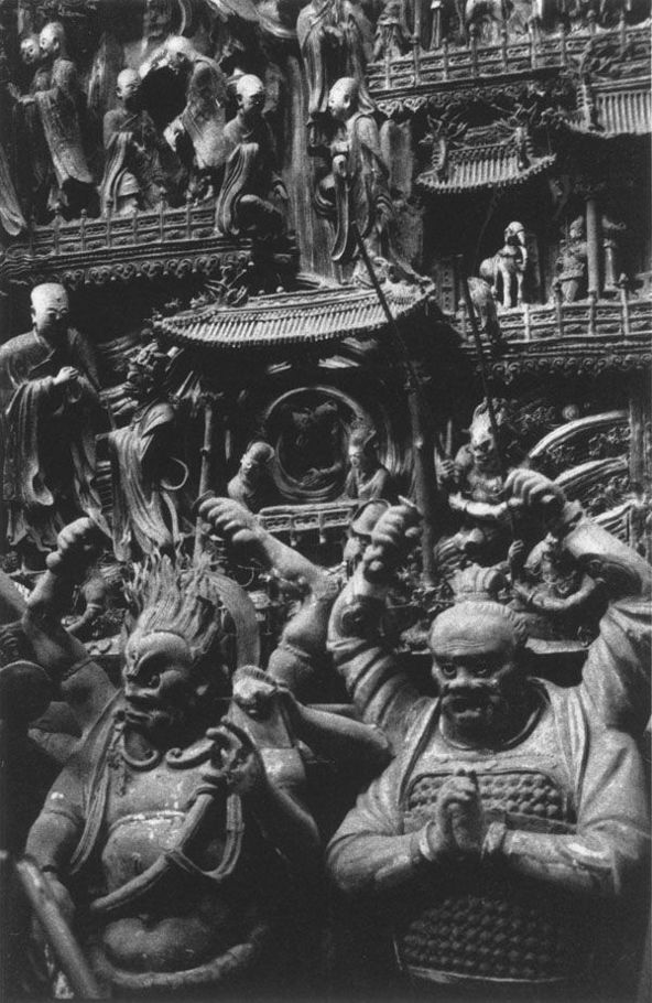 我们很快就发现,这个地方是由党的干部们管理着。开始,他们坚持外国人不能入内。但是经过陪同我们的和尚的多次劝说之后,他们终于同意放我们进去快速地浏览一遍。大殿里的塑像是一个惊人的展览,包括几千件陶塑,其中大部分是13世纪早期塑成的,它们是我们在中国各地所见到的最有震撼力的艺术作品之一。但是几分钟后,管理员就开始变得紧张起来,催着我们赶快出去。