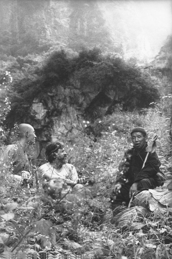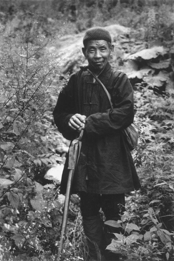大约过了三十分钟左右,我们听到一阵金属的叮当声。几秒钟后,从遮蔽了小路的杂草丛中,闪出一个和尚。那阵叮当声就来自于他的木头拐杖。拐杖顶端有几个金属环,以驱赶恶神恶鬼,以及警告野生动物让路的。拐杖底部安了个小铁铲,是在爬比较滑的山坡时用的。他说,他叫果善,山阳县人——山阳在此地东南大约一百公里处。他六十七岁了,最近的十年,他一直住在大意洞。我问他住在山上的苦况。