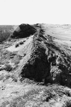 蹬车返回宾馆,我租了一辆出租车去城东十五公里的黄河渡口。我不明白为什么城市要建得离黄河这么远。可能是因为洪水,也可能是因为离灌溉的农田近一些更为合理。到了黄河,我登上一艘简单的金属驳船过河,之后继续向北行驶,在渡口以北两公里,我让司机停下,看了看长城遗址。它向东延伸,消失在漫无边际的沙丘中。此前我在鄂尔多斯沙漠另一边的榆林看到的也是这条长城,这里是它的另一段墙体。司机告诉我一队美国人计划在秋天沿着这段长城徒步到盐池。他说当地一篇文章介绍了此事,还说长城的盐池段保存得非常好。而我现在看的银川这段只隐约还有点城墙的影子。司机说是洪水把墙体破坏了。从长城走不远,就到了俯瞰黄河的古堡——横城堡。眺望黄河对岸,贺兰山紫色的山脊耸立在远方。