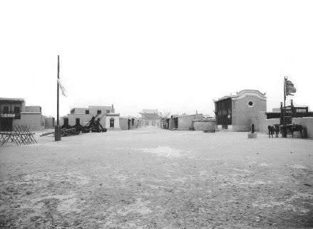 当我们终于到达影视城时,才发现这地方几乎空无一人。我们推开巨大的城门,买了门票,大摇大摆地走在大街上,就好像是两个穿越时空的神枪手。几匹马畏缩在一面土墙下避风,酒吧里空空如也,茶馆中也不见人影。我们沿阶梯登上城墙,眯起眼睛抵挡着飞沙。