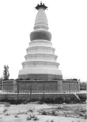 一道炫目的白光闪过,等鸠摩罗什醒过神来,眼前只剩下白马的皮囊。为了纪念他伟大的坐骑,鸠摩罗什埋葬了白马的遗体,在上面建了一座白塔。看!它就矗立在那里,白粉刷过的砖墙在沙漠阳光的照耀下熠熠生辉,铃儿在沙漠微风中叮当作响,游客仍然络绎不绝,前来拜祭西海白龙。