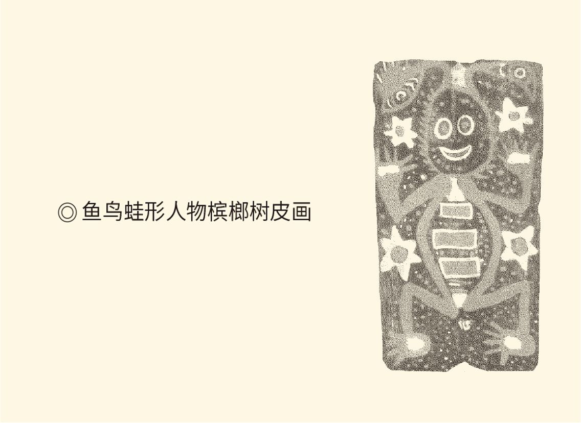 此图来自大洋洲巴布亚新几内亚,图中形象均为生殖崇拜象征。其中鱼、蛙、花象征女性生殖崇拜,鸟象征男性生殖崇拜,详见本卷后面几章的论述。画面主体形象是蛙人,可看作“大洋洲的女娲”。