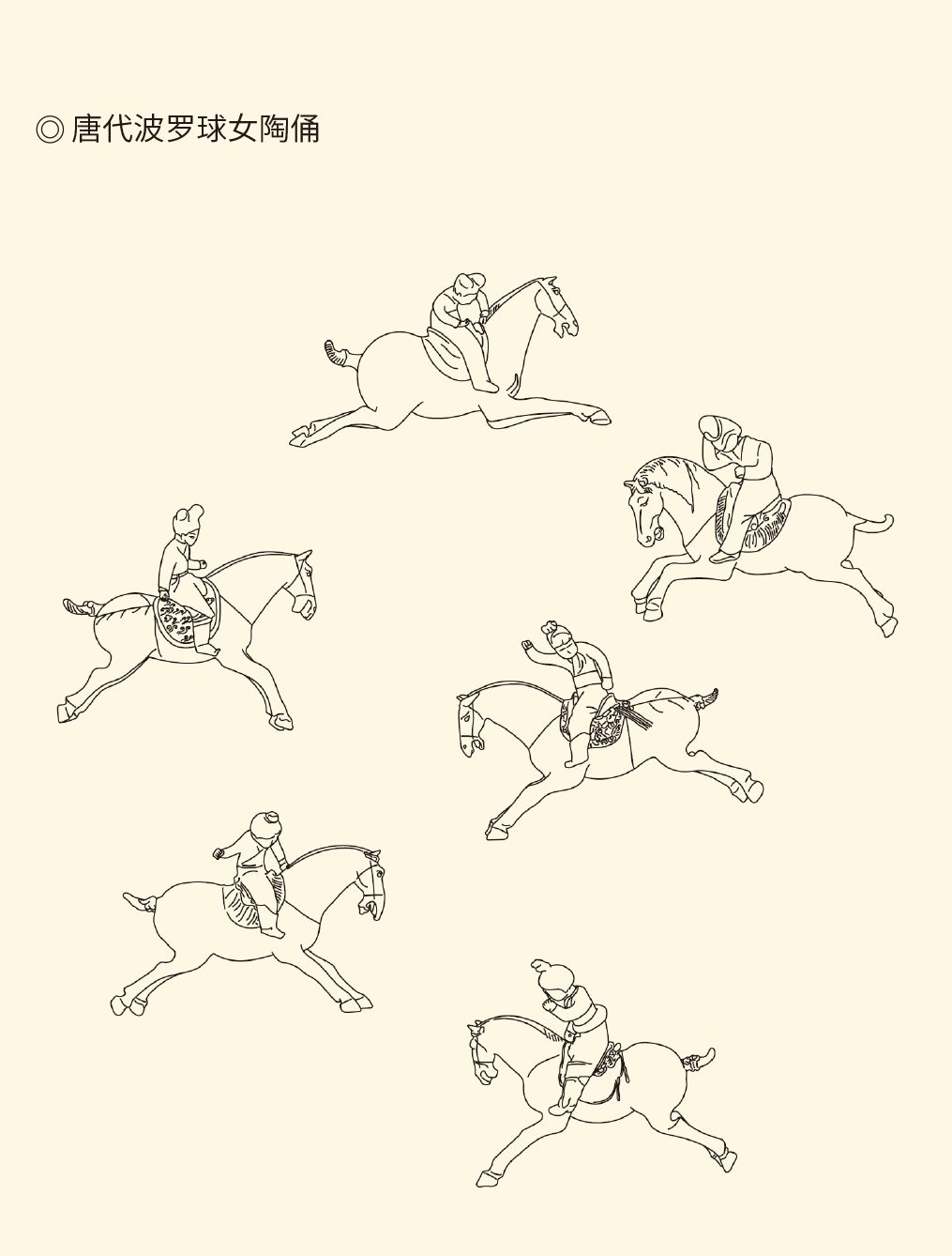 波罗球又称马球,是唐代流行于贵族阶层的运动,一时风行,女子打马球也不少见。这里描绘的是一组唐代波罗球比赛陶俑,马上均为女子,英姿飒爽。原俑藏于法国吉美博物馆。