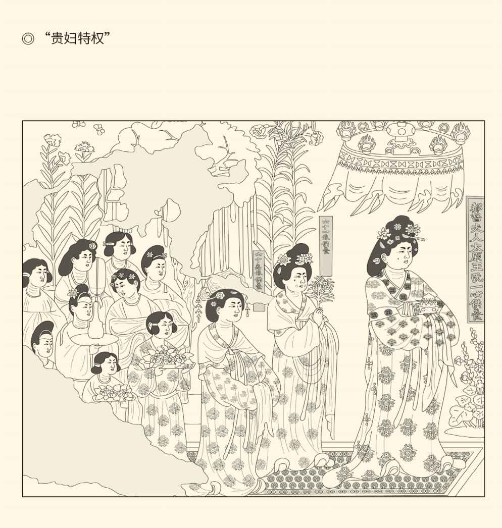 “贵妇特权团伙”的出现是唐代社会普遍现象的一个极致表征,女性(尤其是贵族女性)的社会地位和社会参与达到了令人瞩目的程度。如这张敦煌壁画描绘的“都督夫人太原王氏一心供养”,塑造了雍容虔诚的女性供养人形象。值得一提的是,女仆群像中可见着男袍者,也反映了当时的社会流行风貌。图据敦煌莫高窟130窟壁画。