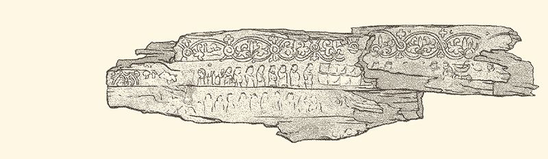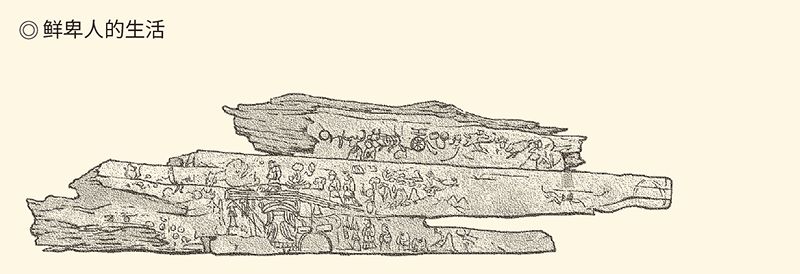 大同智家堡北魏墓棺板画(A板)绘画内容包括两大部分,以山水为界,左边为盛大的车马出行队列,右边为激烈的狩猎场面。