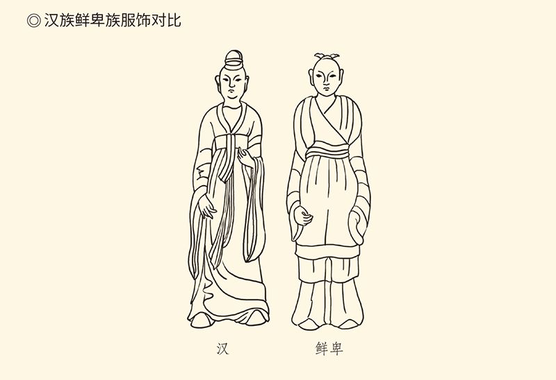 汉族服饰特征为宽袍大袖,喜高冠长袍。鲜卑族喜窄袖且上衣下裳分开,具有鲜明的游牧民族服饰特征。